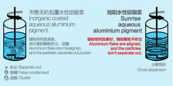 水性鋁顏料包括水性鋁銀漿、水性銀粉,水性鋁銀漿由50%-75%鋁和25%-50%的醇醚類溶劑組成;水性銀粉由97%以上不揮發(fā)物(鋁、有機(jī)硅)和不超過(guò)3%溶劑組成。水性鋁顏料是隨著水性涂料的推廣而發(fā)展起來(lái)的,由于金屬鋁是活潑的兩性金屬元素,易與水、酸、堿發(fā)生反應(yīng)。因此,應(yīng)用于水性樹(shù)脂體系時(shí),必須要經(jīng)過(guò)特殊的表面處理。 目前,市場(chǎng)上水性鋁銀漿制備方法主要分為四類:一、添加阻蝕劑法;二、鉻酸、磷酸、改性樹(shù)脂等及其鹽類鈍化法;三、無(wú)機(jī)二氧化硅包覆法;四、無(wú)機(jī)有機(jī)雙層包覆或雜化包覆法。不同的包覆方法有著各自的優(yōu)缺點(diǎn),隨著社會(huì)的進(jìn)步,對(duì)環(huán)保、性能等要求的提高,后兩種方法包覆的鋁銀漿在市場(chǎng)上占比逐漸提高。表面經(jīng)過(guò)聚合物薄包處理,與水性樹(shù)脂體系有良好的相容性,具有優(yōu)異的金屬感。